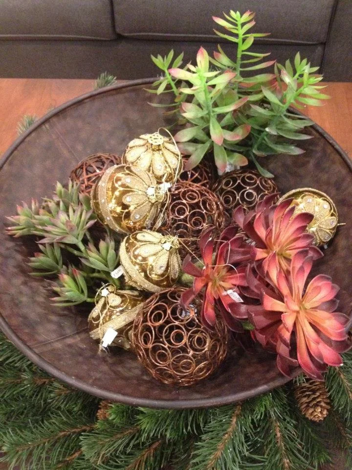 Not sure what to put on your coffee table? Look at layering trays and different bowls. Mix it up when you are looking for things to put in the bowls. Try mixing different textures by combining colored balls, foliage, organic materials and metals.